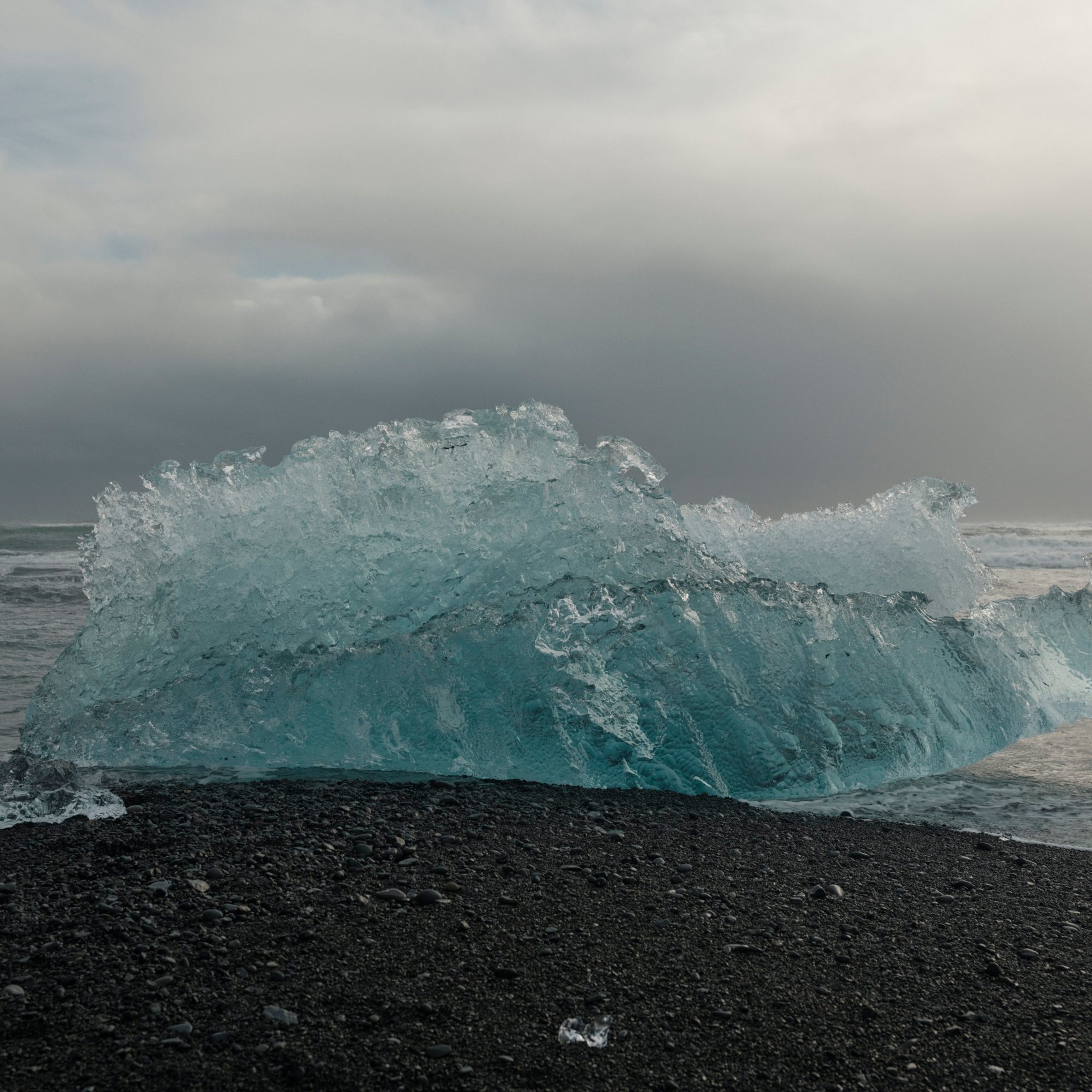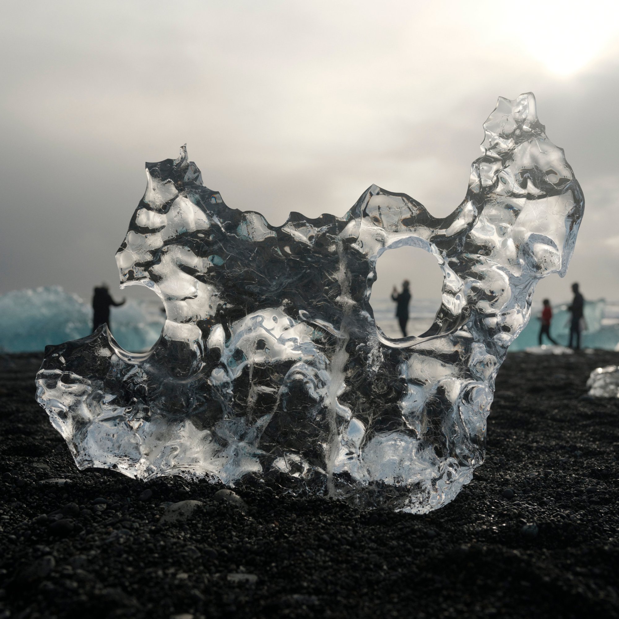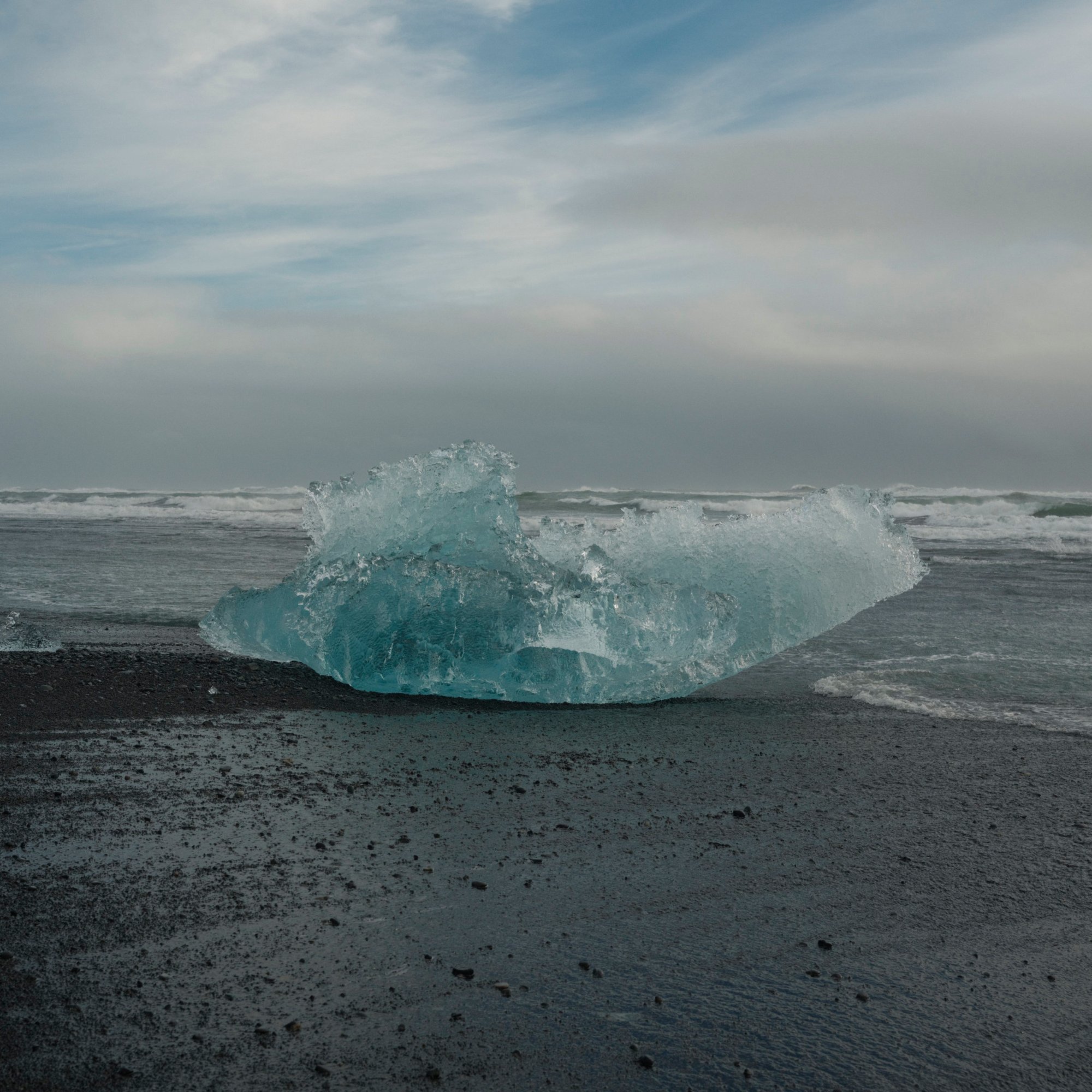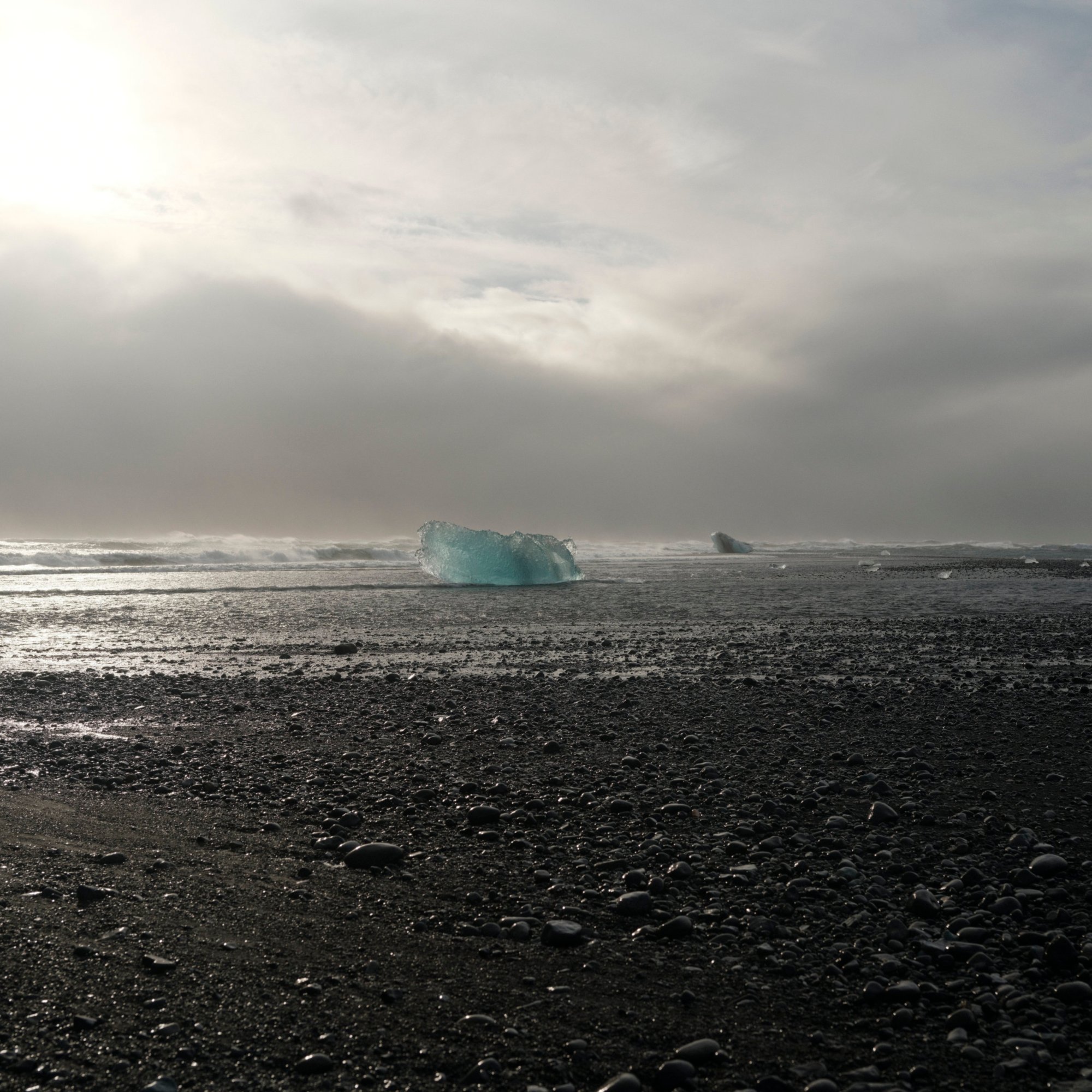 The next morning we’re on our way to Höfn. We pass by the Skeiðará Bridge Monument, where a bridge was swept away by a glacial flood in the mid-nineties. Along the way we stop at the Diamond Beach and the Jökulsárlón Glacier Lagoon. Both the lagoon and beach are fed icebergs and chunks of ice from the glacier on the northern end of the lagoon. Ten years ago, most of this lagoon was filled with ice. Now, my heart sank on the lack of ice in the lagoon. I’m not certain about if it’s a seasonal thing, but it did seem like a very visible result of climate change. On the beach, tourists walked among and took photos of the ice that washed ashore. Some of them sat on the larger pieces for a photo op. Sneaker waves reach out to the tourists catching them off guard causing them to dart further away from the shore.