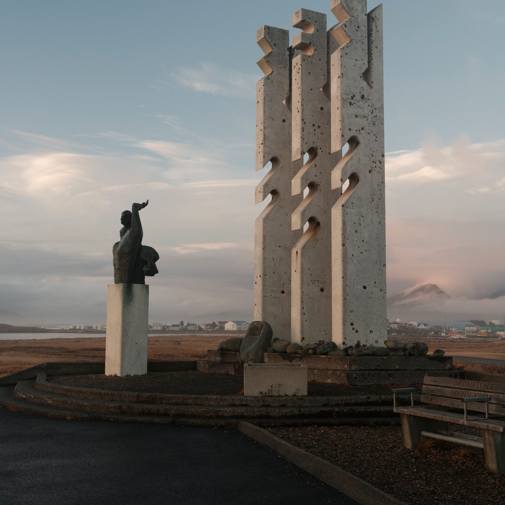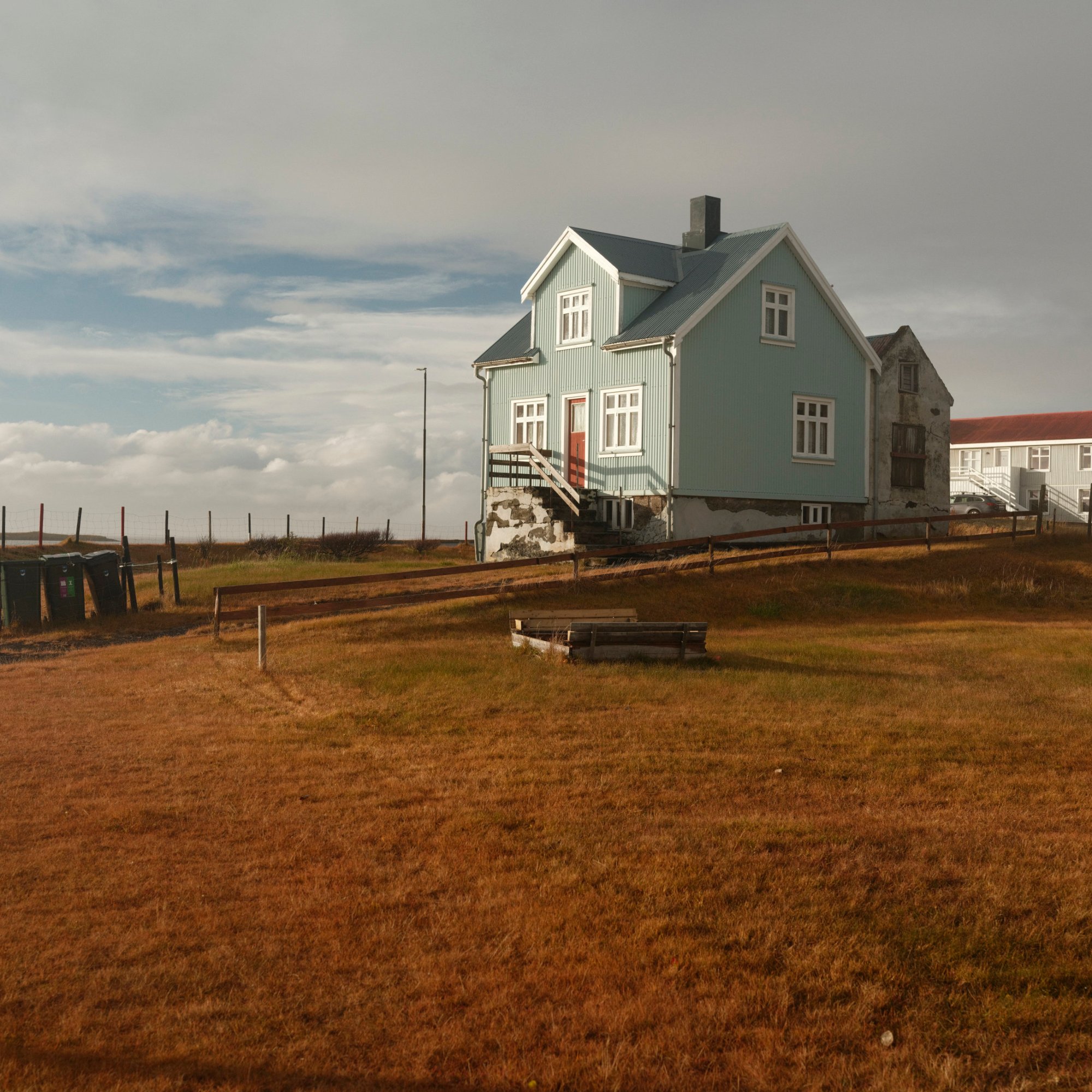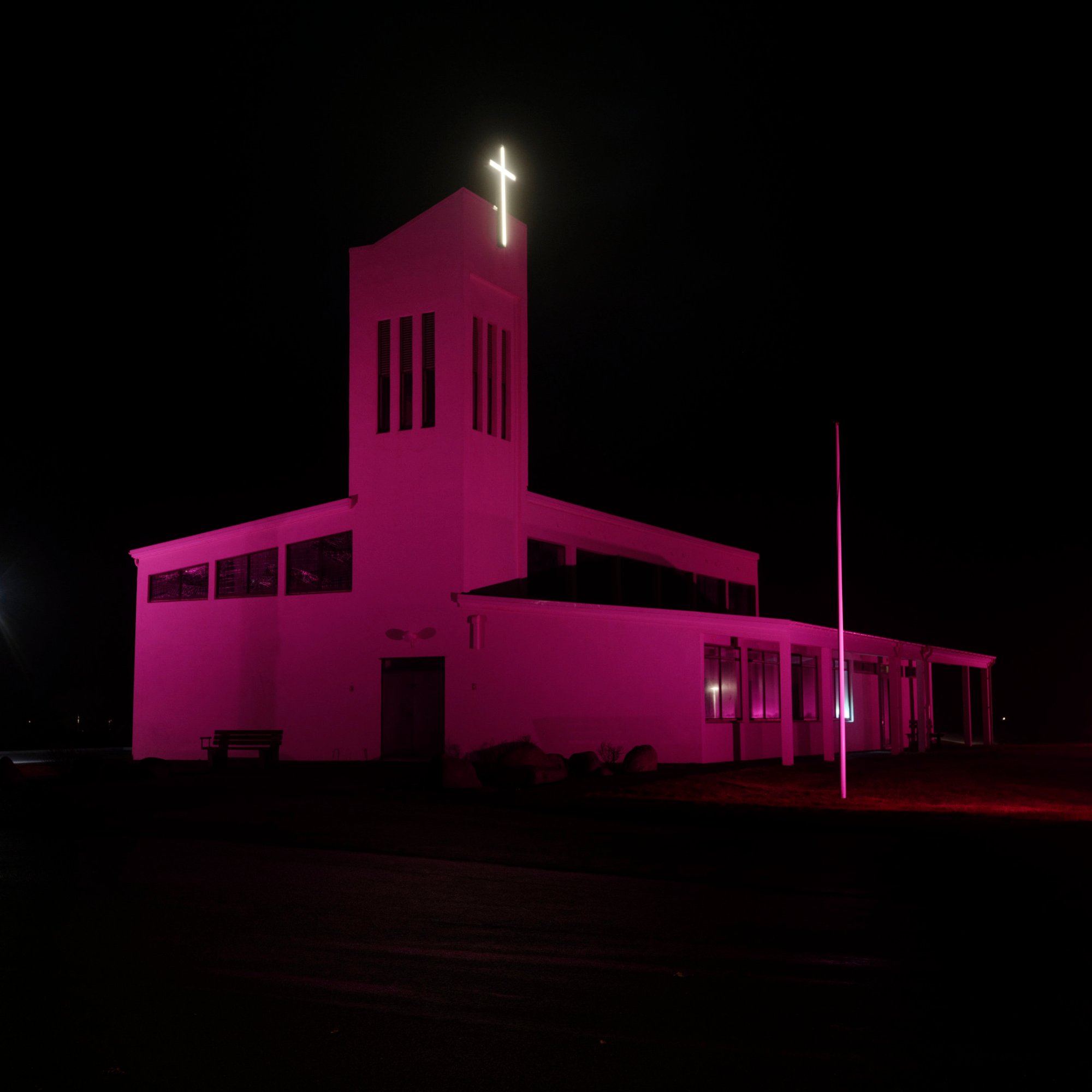 We drive on to Höfn. A small town on the coast, with a decent harbour, with some commercial ships resting in its waters. The nearby islands were once used as an airbase for the Allies in WWII. At night, the nearby church is lit in purple, as is a large water tank near a camping/caravan park.